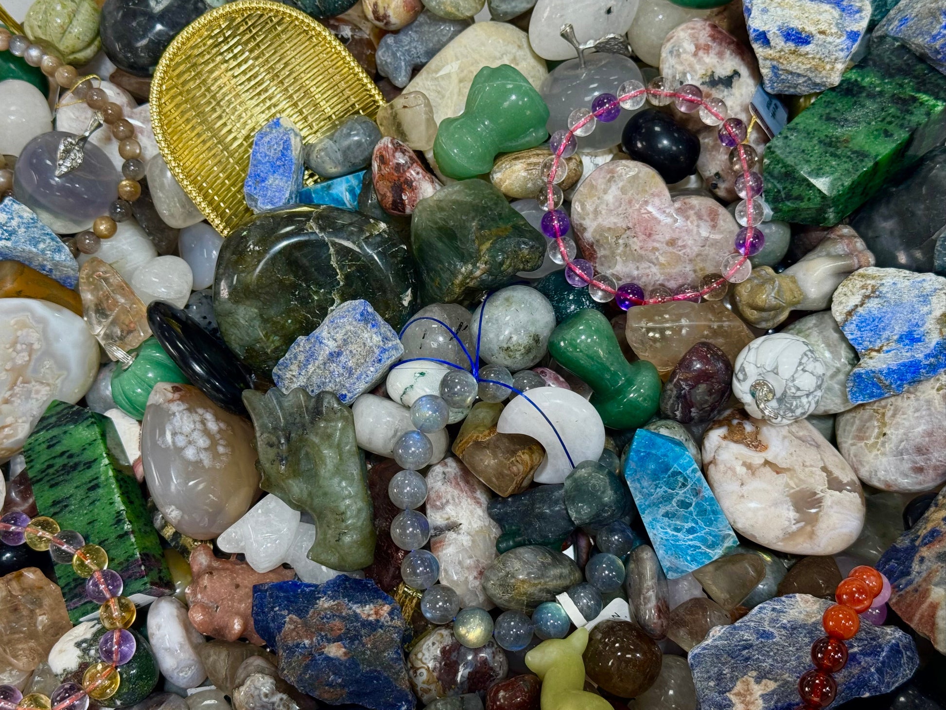 Mostly crushed stones and pieces, larger sizes may also contain crystal fragments, rough stones, tower stones, palm stones, sphere stones, heart stones...